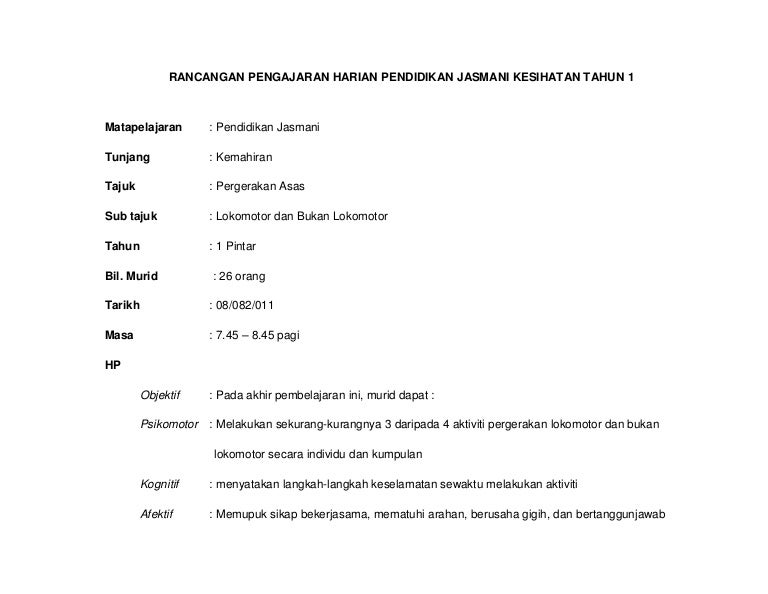 Rancangan Pengajaran Harian Pendidikan Jasmani Kesihatan Tahun 1